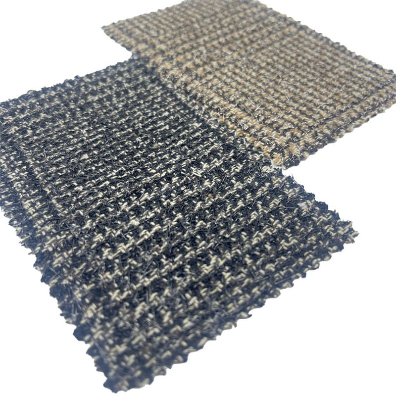 এই ফ্যাব্রিক, আর্টিকেল 4336 হিসাবে মনোনীত, 5% উল এবং 95% অন্যান্য ফাইবার দ্বারা গঠিত একটি টুইড টেক্সটাইল। প্রতি ইউনিট এলাকা 550 গ্রাম/মি ভর সহ, এটি একটি ভারী ওজনের নির্মাণ উপস্থাপন করে। কালো এবং বাদামী পৃষ্ঠটি একটি হাউন্ডস্টুথ মোটিফের সাথে একটি চেক প্যাটার্নকে একত্রিত করে, যা বয়ন প্রক্রিয়ার সময় ধাতব সুতার সাথে একত্রিত হয়। এই কৌশলটি একটি যৌগিক নকশা তৈরি করে যেখানে জ্যামিতিক প্যাটার্নগুলি আলোক-প্রতিফলিত উপাদান দ্বারা উচ্চারিত হয়। ধাতব সুতার অন্তর্ভুক্তি বোনা ভিত্তির বিপরীতে বৈপরীত্য চাক্ষুষ প্রভাব প্রবর্তন করে। প্রযুক্তিগত বৈশিষ্ট্যের ফলে বহু-স্তরযুক্ত ভিজ্যুয়াল জটিলতা এবং কাঠামোগত ঘনত্ব সহ একটি উপাদান তৈরি হয়, এটি এমন প্রকল্পগুলির জন্য প্রযোজ্য করে যেখানে প্যাটার্নের উচ্চারণ এবং পৃষ্ঠের ভিন্নতা প্রয়োজন৷